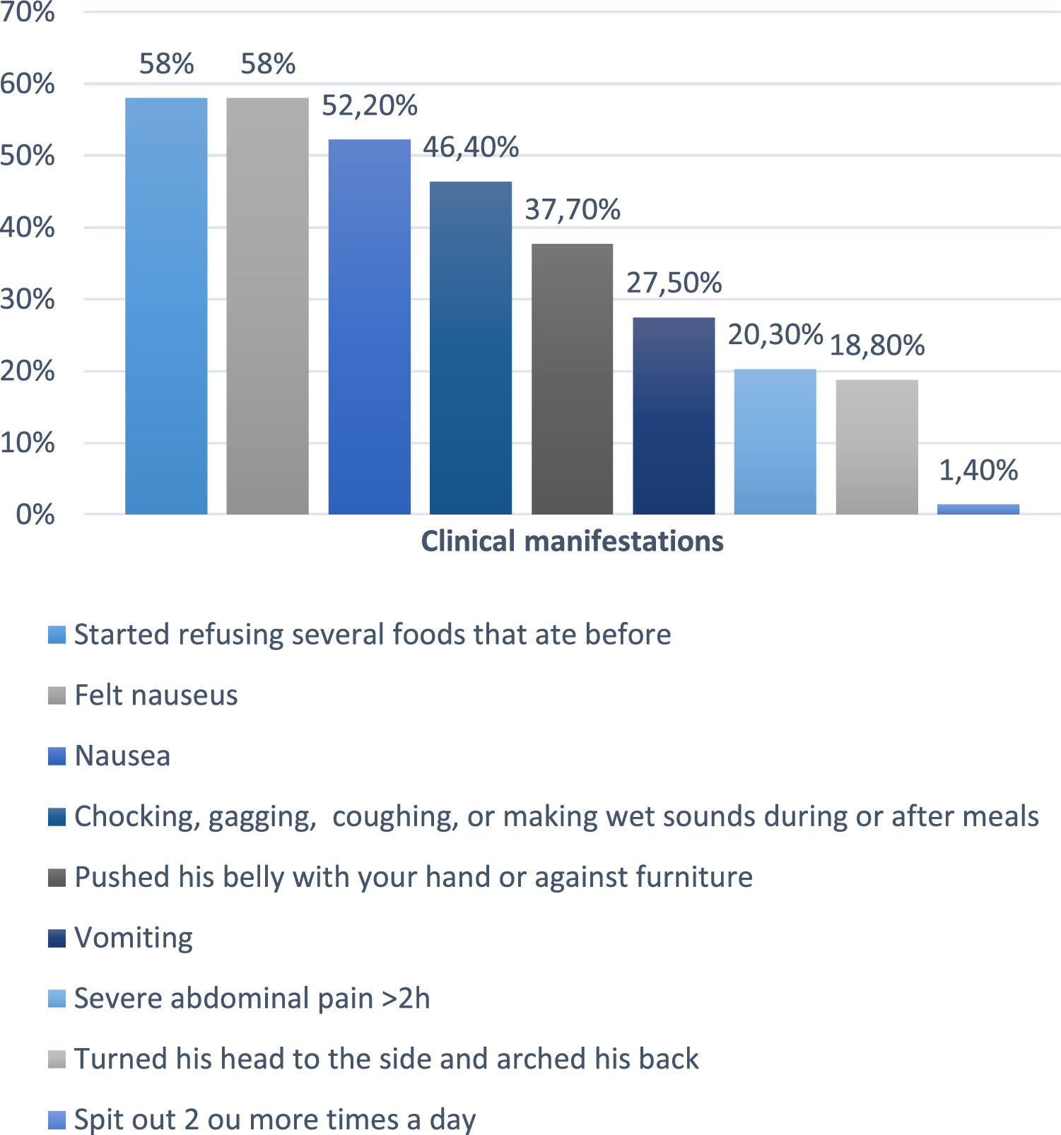 Among the five children who underwent upper GI endoscopy but demonstrated no abnormalities on either macroscopic or microscopic evaluation, several exhibited warning signs consistent with gastroesophageal reflux disease (GERD). These clinical manifestations were indistinguishable from those observed in patients with abnormal findings. Reported symptoms included nausea in five children, abdominal pain in four, refusal to consume previously accepted foods in four, choking, gagging, coughing, or producing wet vocalizations during or after meals in four, head-turning and back-arching in one, and abdominal pressure applied by hand or against furniture in one child.
