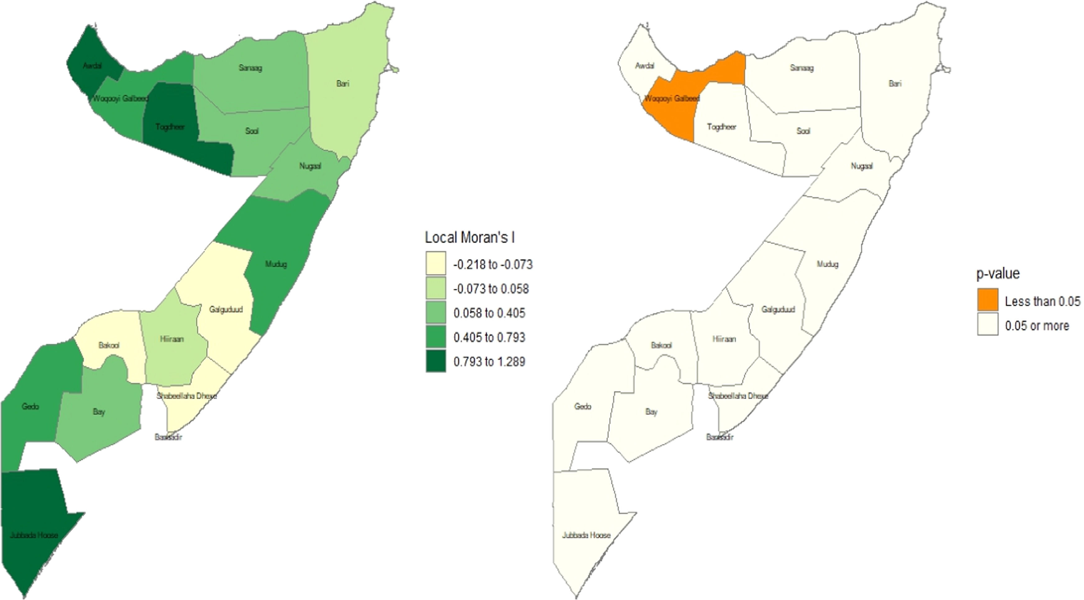 Local Moran’s I and significanceA Local Indicators of Spatial Association (LISA) analysis was conducted to identify significant spatial clusters of newborn care practices across the regions of Somalia, and the findings are illustrated in Figure 4. The analysis revealed a single, statistically significant "hot spot" in the northwestern region of Woqooyi Galbeed, which exhibited a high positive Local Moran's I value (in the 0.793 to 1.289 range) and a p-value of less than 0.05. This result indicates a significantly high cluster, where neighbors with similarly high uptake surround a region with a high uptake of recommended newborn care practices. While other regions, such as Togdheer and Jubbada Hoose, also showed high positive Moran's I values, these patterns were not statistically significant (p ≥ 0.05). Consequently, the evidence suggests a highly localized geographical clustering of favorable newborn care practices in the northwest, whereas the distribution of these practices elsewhere in the country appears to be spatially random at this regional scale.