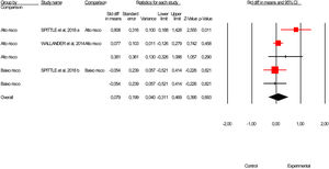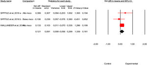 To obtain the analysis of the combined estimate of the intervention effects, post-intervention scores were extracted and analyzed using the fixed-effect model. In the case of statistically significant heterogeneity (I2>40%), a random effects model was applied. The pooled data from all outcomes were recorded as the Standardized Mean Difference (SMD) and their respective 95% Confidence Intervals (95% CI). The analyses were performed using the Comprehensive Meta-Analysis software30 (version 3.0; Biostat – Englewood, New Jersey, USA). The critical value to reject the null hypothesis was set at a level of 0.05 (two-tailed).
