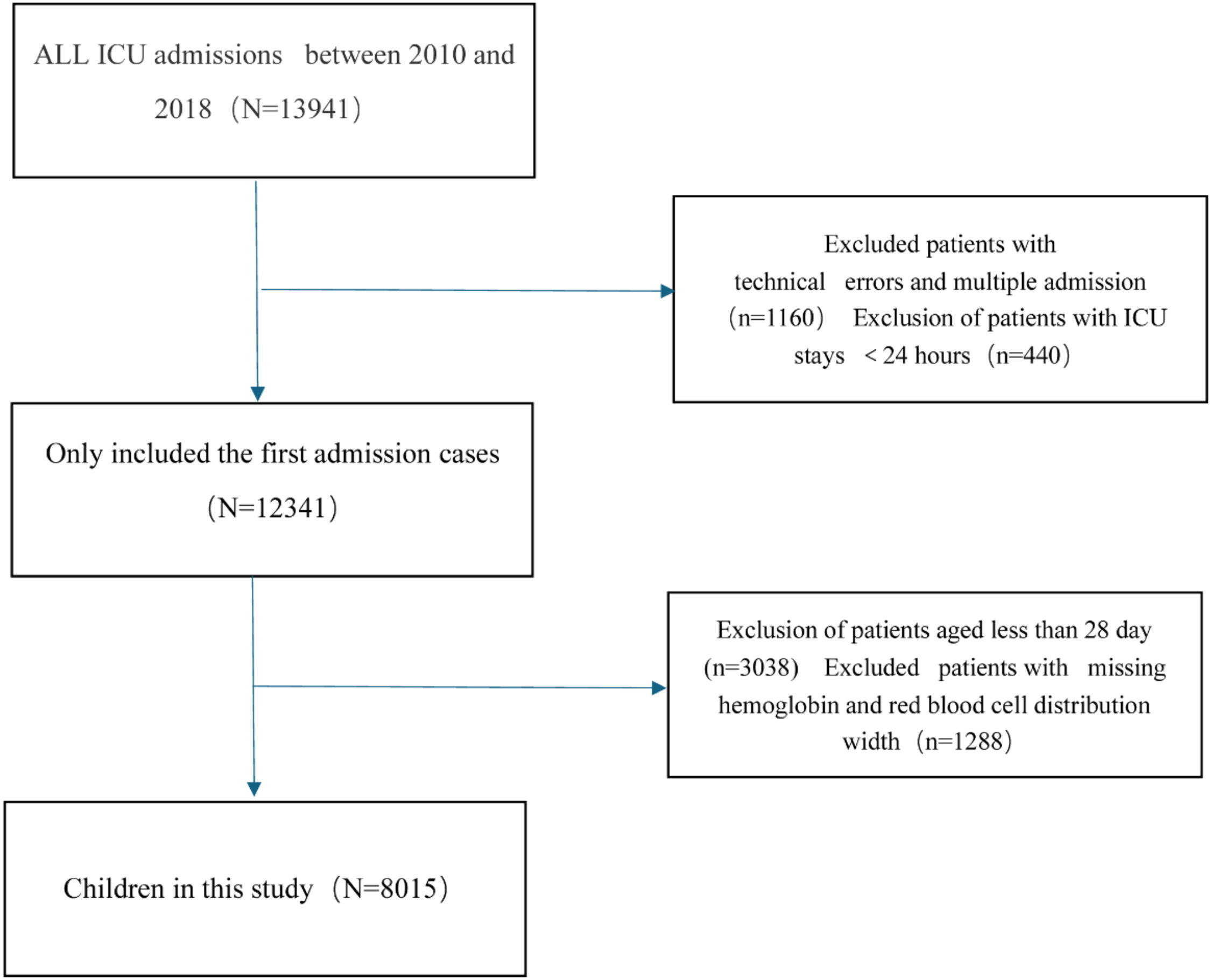 Study populationThe cohort comprised 8,015 pediatric patients (28 days to < 18 years) admitted to non-neonatal ICUs. Initial hospitalization records were prioritized for analysis. Exclusion criteria included: 1) Missing hemoglobin/RDW measurements, 2) ICU duration < 24 hours. The flowchart of this cohort study is illustrated in Figure 1.